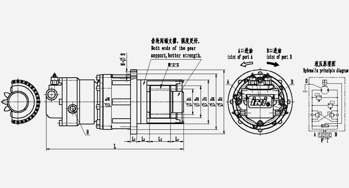 Die hydraulischen Schwenkantriebe der IYH-Serie sind Eigenentwicklungen mit unabhängigen geistigen Eigentumsrechten. Sie bestehen hauptsächlich aus Hydraulikmotoren, hydraulischen Mehrscheibenbremsen, Planetengetrieben vom Typ C und Verteilern. Hydraulikmotoren können